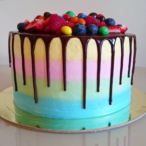 Радужный тортик с глазурью, украшенный свежими ягодками и M&M"s